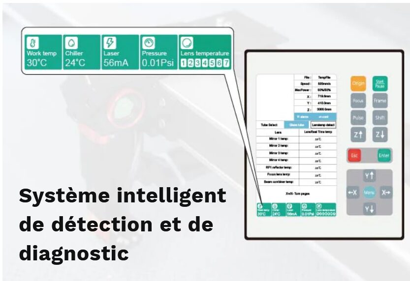 Pour une configuration rapide et une utilisation facile, le nouveau contrôleur Ruida fait remonter les informations à l’écran : il est même possible d’y surveiller l’ampérage (mA) et la température de l’eau.